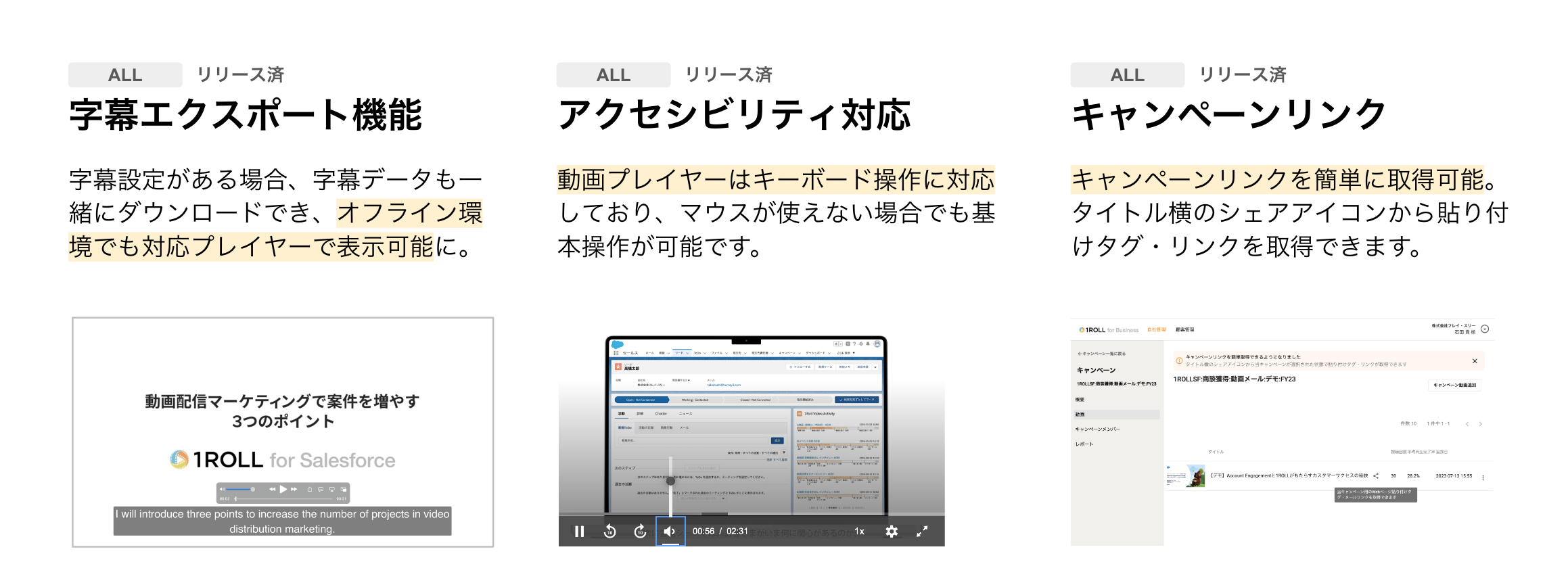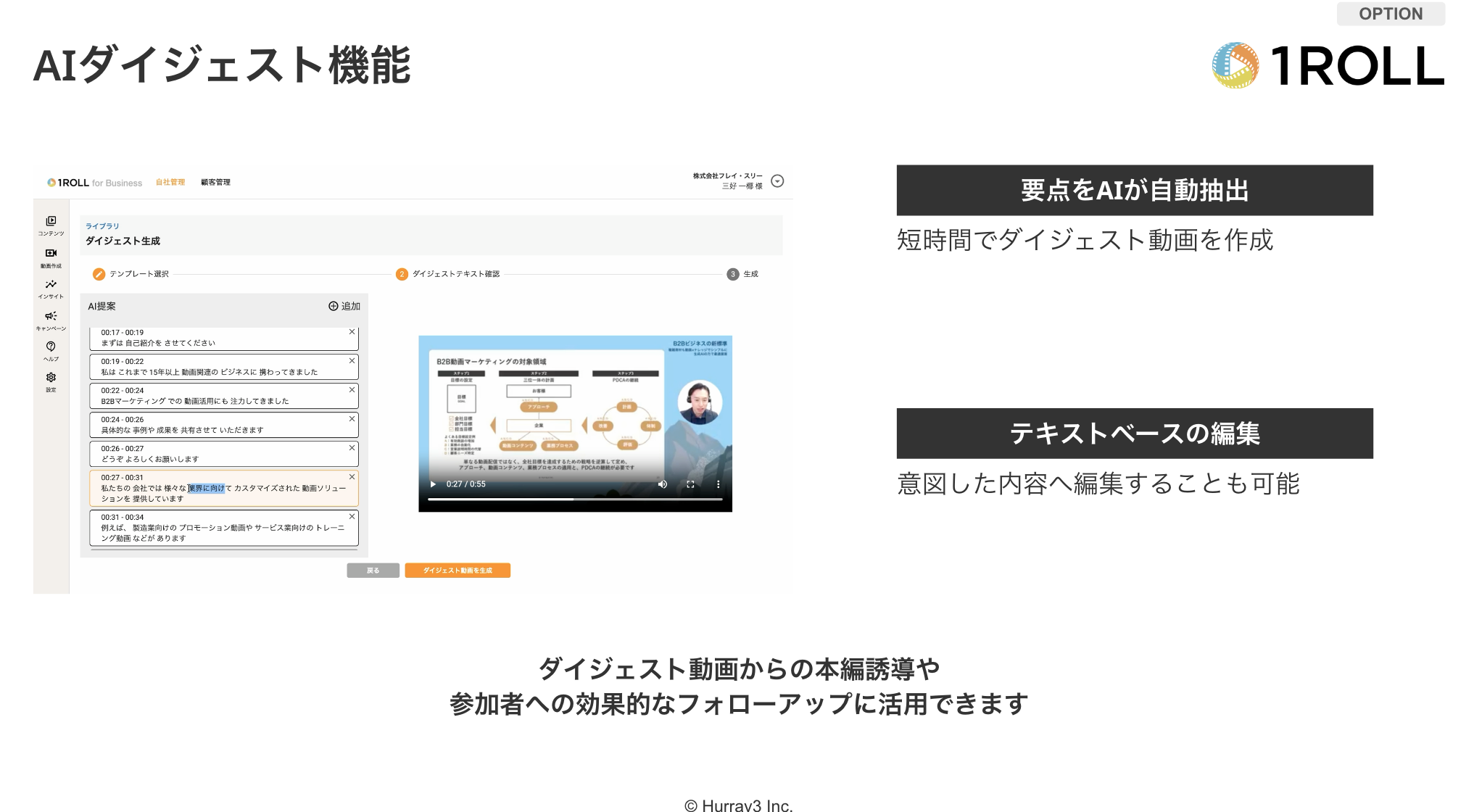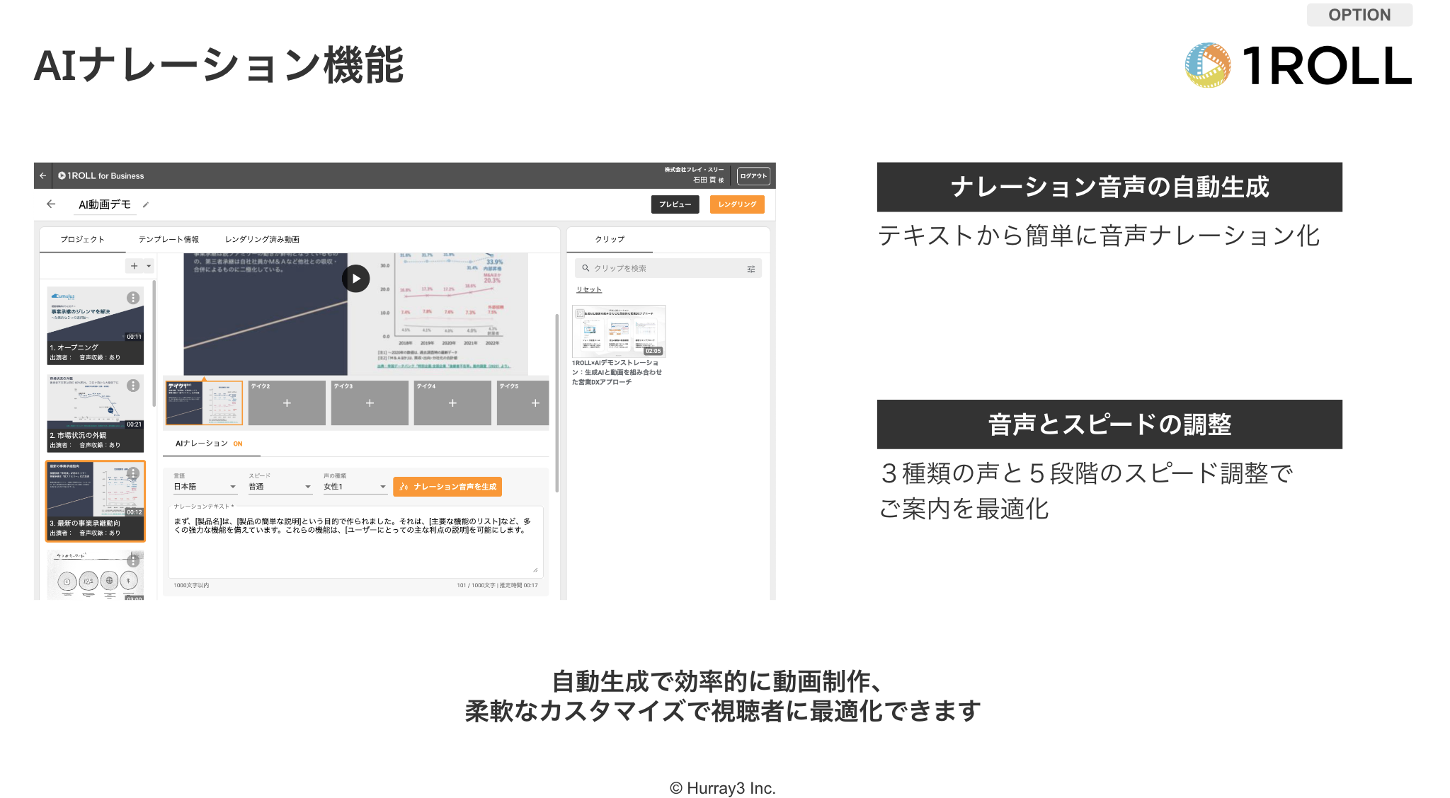 1ROLLの2024年初頭のアップデートでは、AIダイジェストとAIナレーションという新機能が導入されました。AIダイジェストは動画コンテンツをショート動画化し、視聴率向上や営業機会の増加を目指します。AIナレーションはテキストから音声ナレーションを自動生成し、リソースの効率化やコスト削減、迅速なニーズ対応を可能にします。これらの新機能は、マーケティング、セールス、顧客サポートなどの業務で活用が期待できます。
