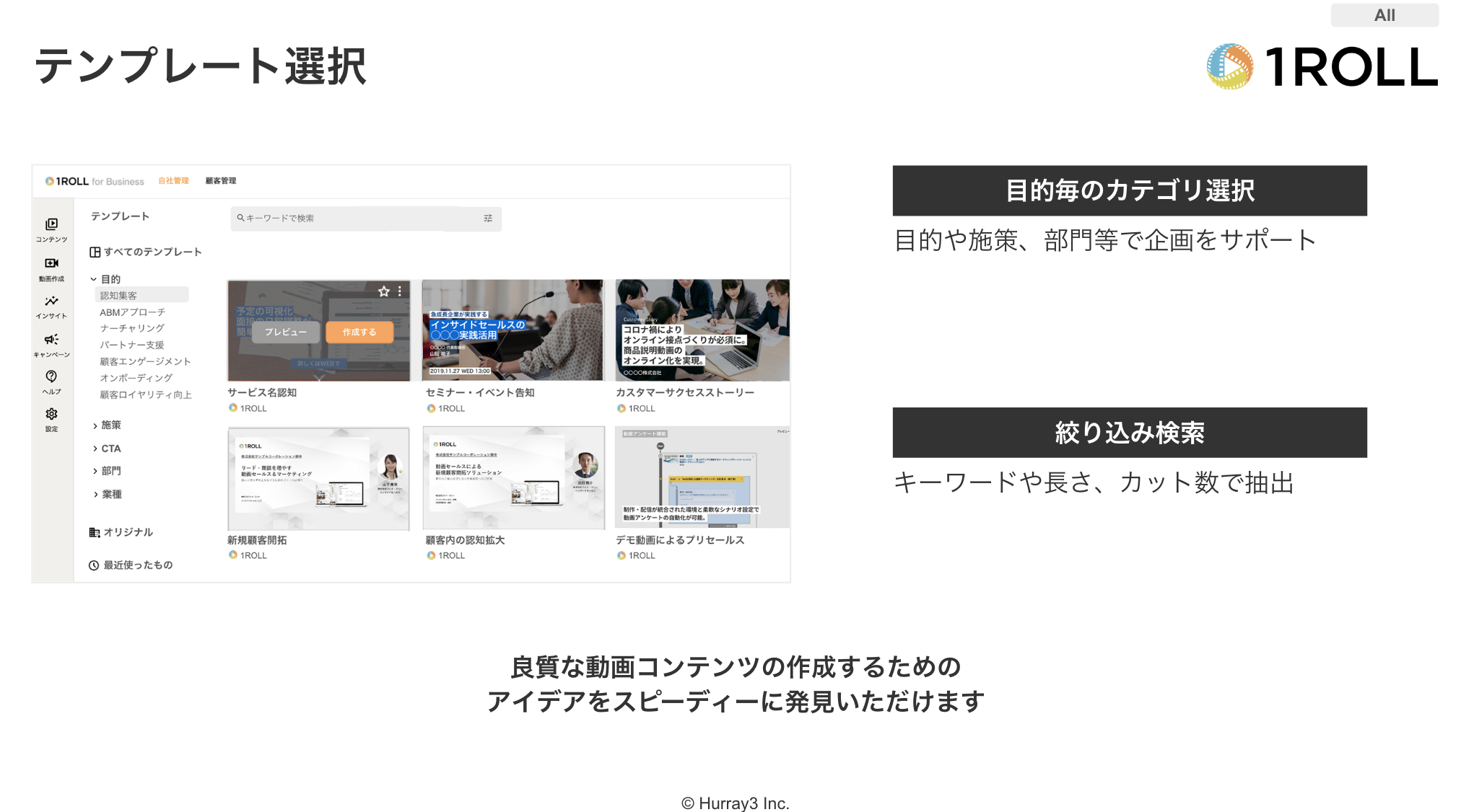 さらにAIナレーションのテンプレートや可変カットのテンプレートの抽出も可能です。テンプレートごとにサンプルスクリプトやスライドも用意していきます。