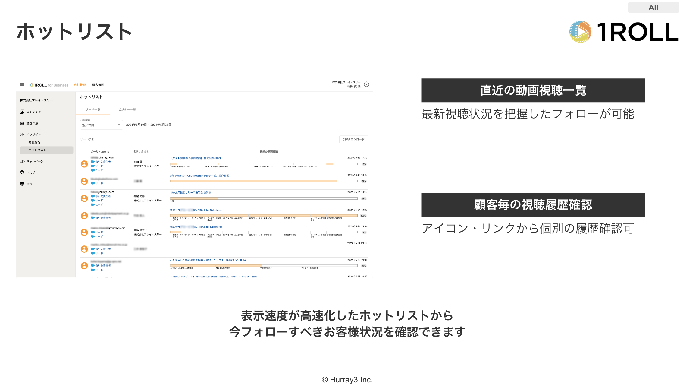 動画視聴履歴も一覧で表示されるようになりまして 顧客がどのようなコンテンツに興味を持っているか一早く把握できるようになっています。