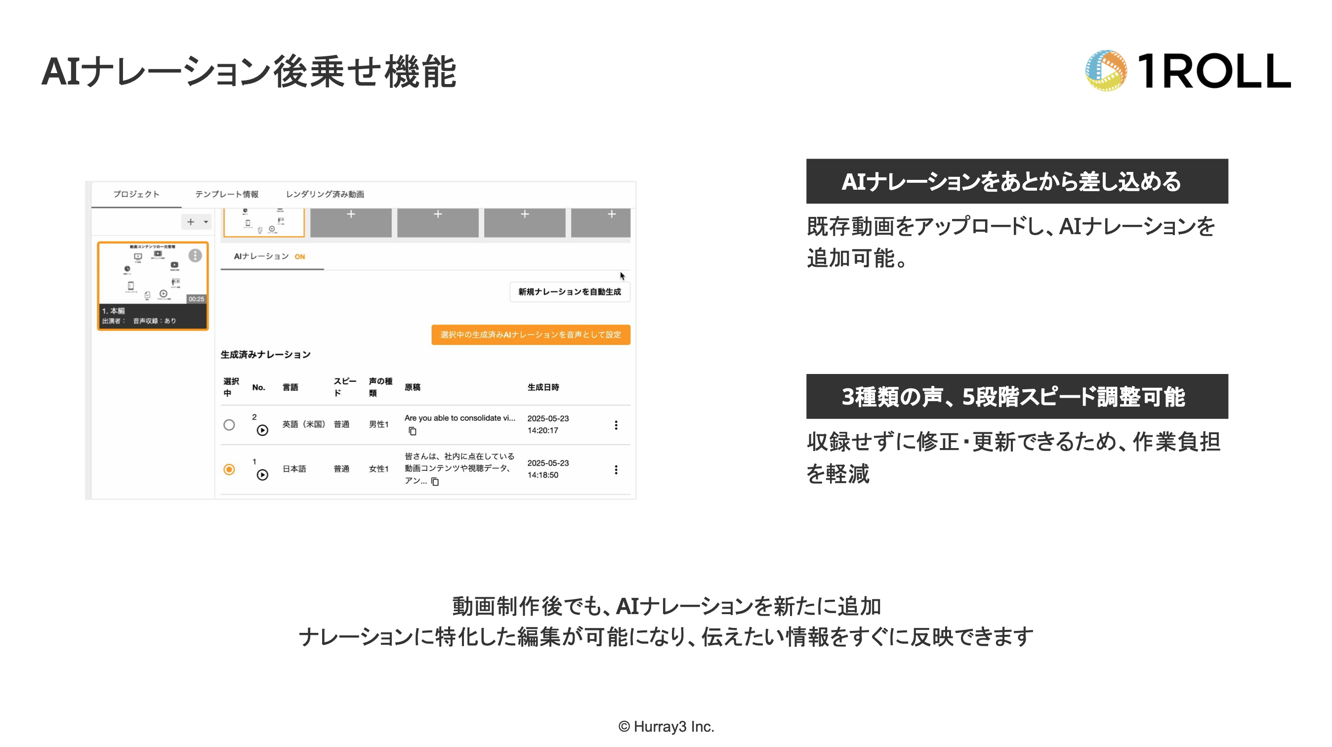 利用可能な動画はあるが言語や説明の更新に対応できない場合に、動画素材を活かしたままAIナレーションで動画を最新化を行えます。既存動画に3種のAI音声をテキスト入力だけで追加可能。5段階スピードで多言語対応も容易に。