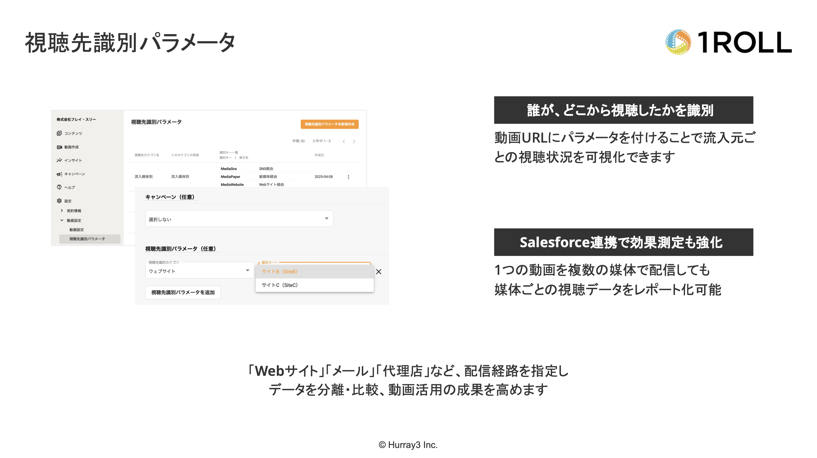 配信経路(Web / メール / 代理店 など)ごとにURLを自動付与し、Salesforceと連携して媒体別成果を可視化。