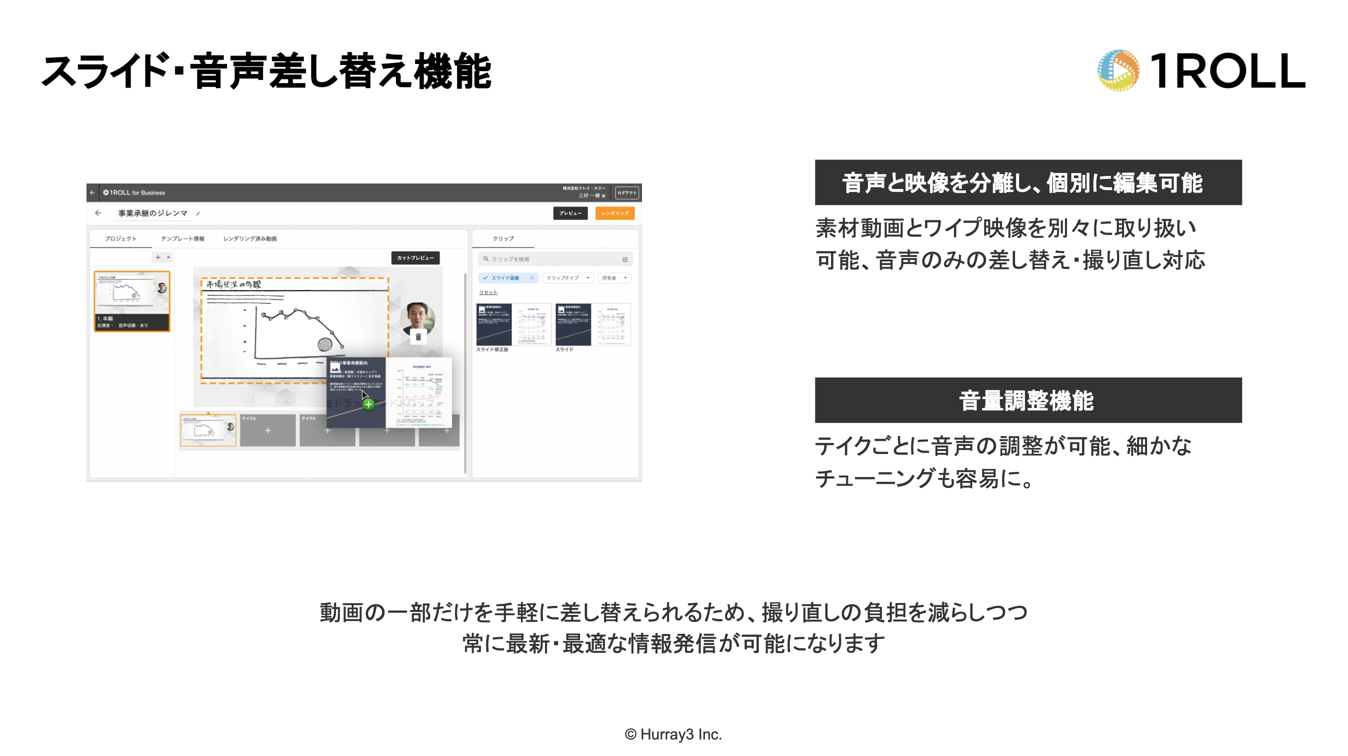 完成後の動画でも音声・映像を個別に再編集可能。 テイクごとの音量調整もサポートし、撮り直し負荷を大幅に削減します。