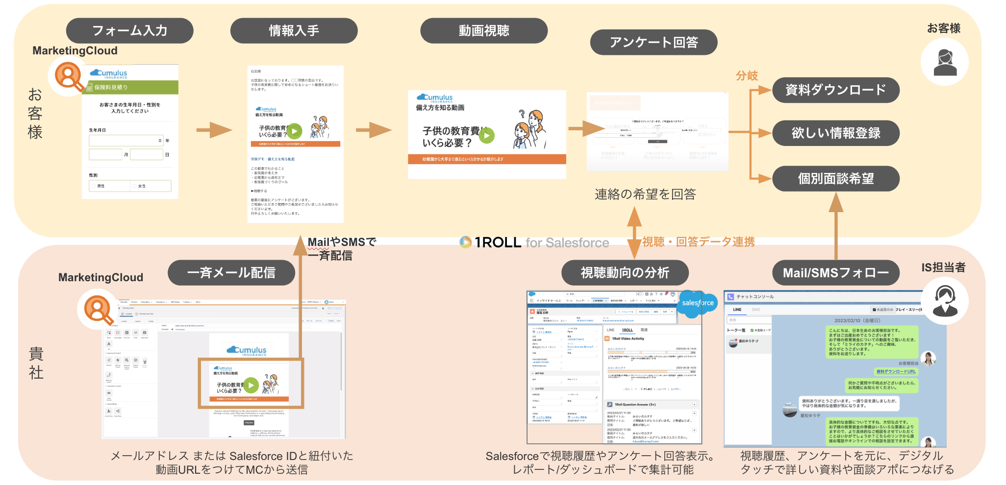 お客様の視聴データやアンケートの回答結果は、1ROLL for Salesforceを通じて、
